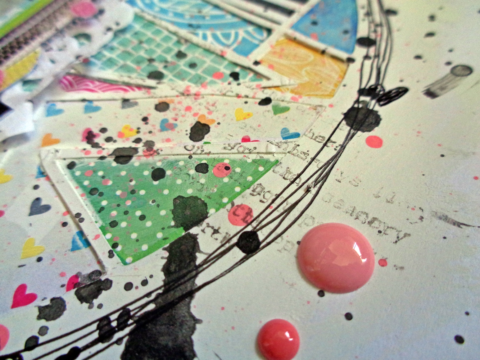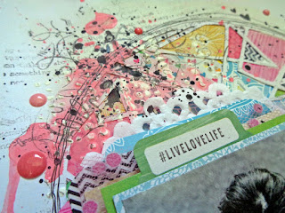 Uma página muito colorida e cheia de volume, criada a partir de gesso, paper de scrapbook, de várias cores, e tecido roda.
