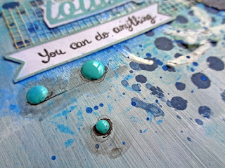 O primeiro passo foi aplicar em toda a minha página base acrílica e depois de secar adicionei tinta acrílica Americana da Deco art nas cores Wedgewood Blue e Desert Turquoise. Para criar relevo utilizei o stencil Mini Coffee Splotch da TCW com gesso acrílico da Acrilex. Usei distress ink da ranger, lápis de aguarela, crimbos, apliques decorativos, washing tape, entre outros,,,