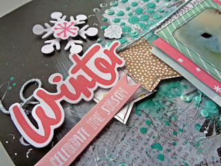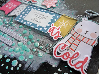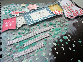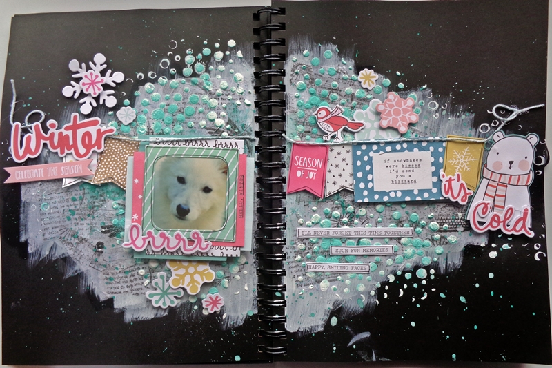 Infelizmente o trabalho que tinha realizado para o Desafio Mixed Media Inverno do Paper Scrappers não preenchia os requisitos do desafio. Por isso, fiz mais um trabalhinho mas desta vez num caderno A4, abrangendo duas folhas, e adicionei a fotografia da minha cadelinha a Sasha.