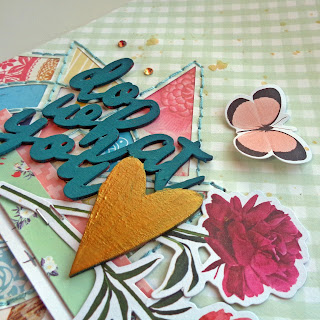 Terminado o meu fundo, comecei a decorar o meu trabalho com as madeiras e os papéis decorativos que vieram com o kit.